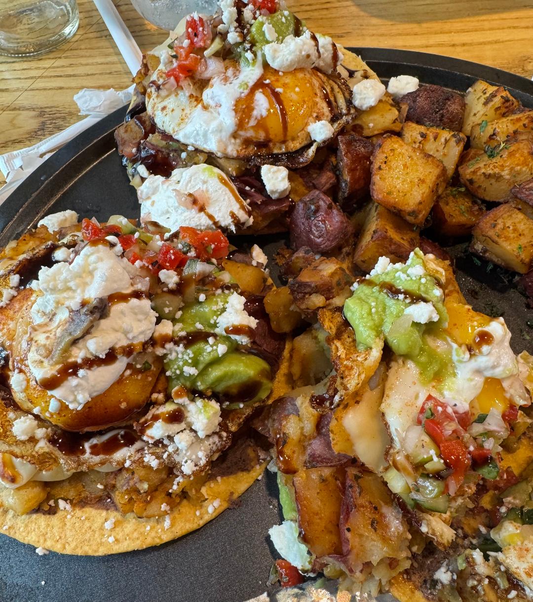 Took my father to physical therapy yesterday and then one of our favorite cafes for lunch. I'm not even sure of everything that was in these, but they were soooo good: tostadas topped with potato, feta cheese, avocado, diced red peppers, a fried egg, black bean spread, oh my. Not a low calorie meal, that's for sure!