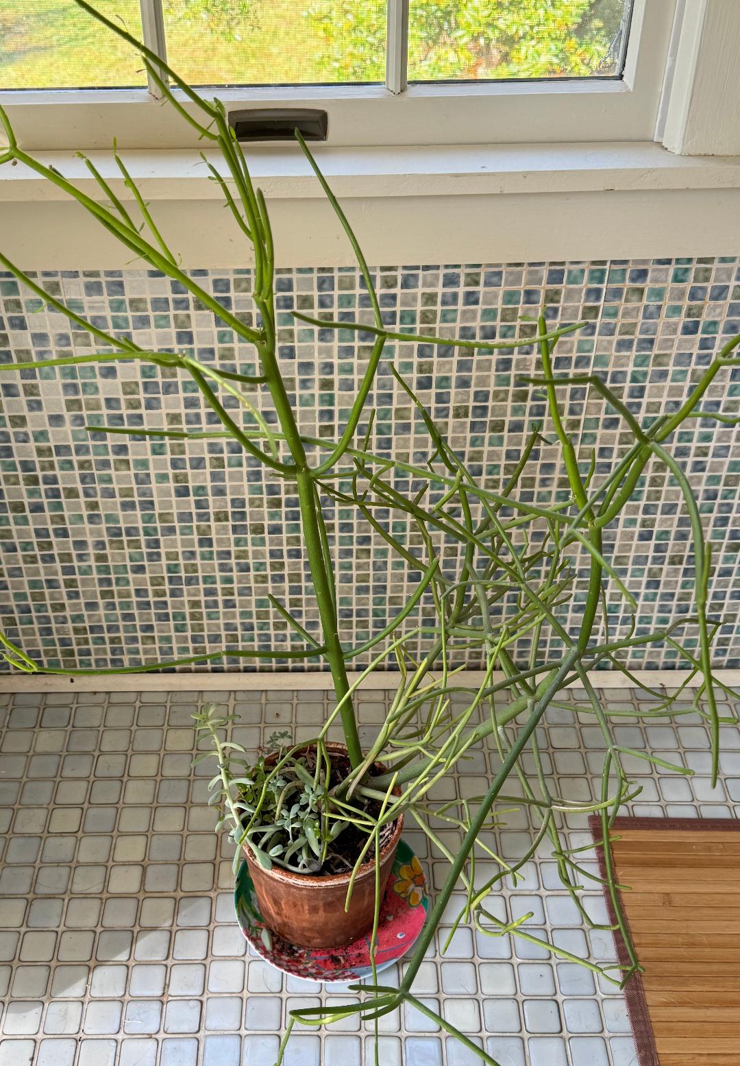 In the past year, I realized my house plants were threatening to take over this small space, so I have winnowed down my collection of cacti and succulents considerably. I think I now have 8 now, plus 2 pothos. But I still have this pencil cactus, which loves its spot in my sunny bathroom. I may bring a little Ikea stool down from the attic for her.