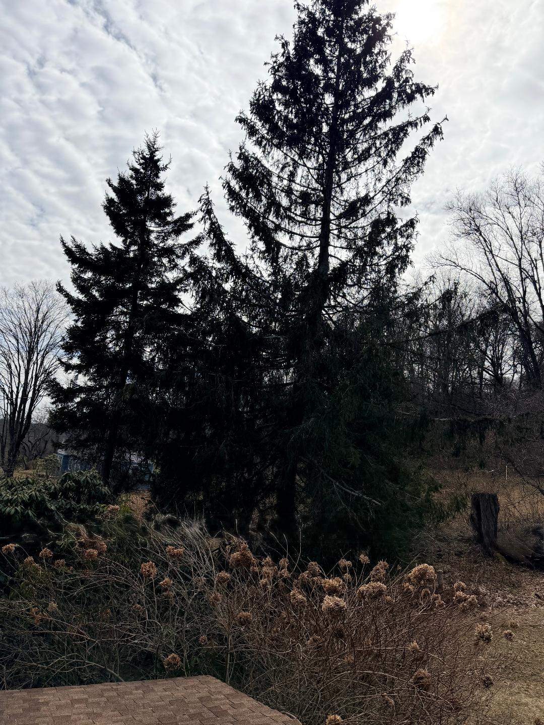 Norway spruces are especially prone to coming down in a strong storm because they have a shallow root system, which can fail when the ground is totally saturated; also, their arching branches act like a sail that catches high winds.